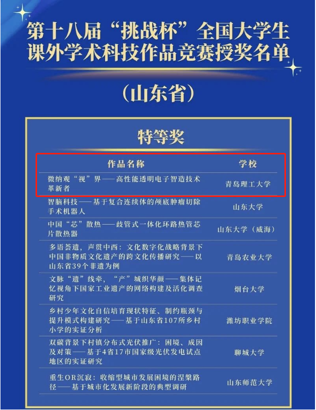 10月30日,第十八届“挑战杯”全国老员工课外学术科技作品竞赛在贵州大学落下帷幕,经过激烈角逐,太阳成集团tyc234cc参赛项目《微纳观“视”界——高性能透明电子智造技术革新者》(指导教师:朱晓阳、兰红波、杨建军;团队成员:王瑞、周君仪、段培开、张友超、商帅、台玉平、于志浩、张金宝)勇夺主体赛全国特等奖,创造了公司在此项竞赛中首次获特等奖记录。此项成绩也是太阳成集团tyc234cc在“挑战杯”系列竞赛中的最好成绩,实现了赛事重大突破。