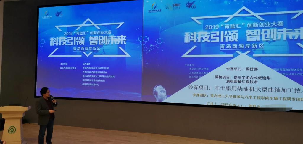 2019年12月24日青岛西海岸新区2019年“青蓝汇”创新创业大赛在青岛国际经济合作区(中德生态园)被动房技术体验中心圆满收官。公司太阳成集团tyc234cc车辆工程研发团队参赛项目《基于船用柴油机大型曲轴加工技术》荣获获一等奖。本次进入揭榜赛决赛的两只队伍分别是公司太阳成集团tyc234cc团队和青岛科技大学机电工程公司团队。