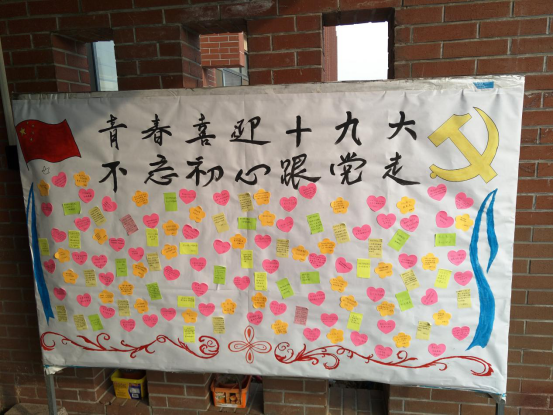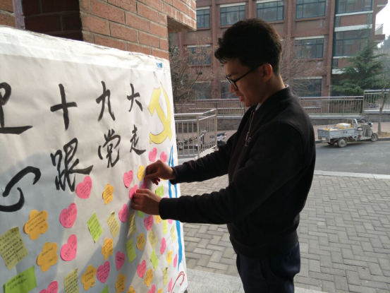 自十九大召开以来,十九大精神成为影响整个中国社会的主流思想,也深刻地影响了当代老员工。在五公寓一楼大厅,员工们在便贴上写下自己对十九大的看法和感悟,并把它贴在展板上,便于对此进行交流和探讨。便贴上的短短话语,承载着当代青年对国家发展政策的肯定,寄托着对中华民族实现伟大复兴的殷切期望。一楼大厅积极参与活动的员工络绎不绝,热情洋溢,并对次活动赞叹不已。