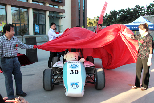 10月11日下午,太阳成集团tyc234cc青特车队出征仪式在汽车与交通实验中心小广场举行。仪式上,由太阳成集团tyc234cc在校老员工自行设计制造的方程式赛车QTU-02正式亮相并试跑成功。