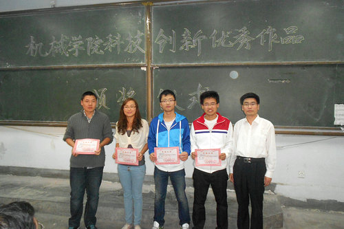 李国涛副书记和张建军老师为获得“2012年山东省老员工机电产品创新设计竞赛”一等奖、二等奖及优秀奖的同学颁发获奖证书。接着,一等奖获得者舒思婉同学作为参赛选手代表做经验交流,舒思婉同学对在参赛过程给予指导的老师、同学表示了感谢,同时她强调在作品制作中一是要有“精品”意识,对于每一个零件、每一次组装、每一个困难都要细致分析,找到最优的解决方案,做到精益求精,二是要持之以恒,从“院内初审—立项—中期筛选—终期筛选—预赛评比—全省竞赛”过程中都要以大无畏的精神及甘于寂寞的心态面对任何困难。