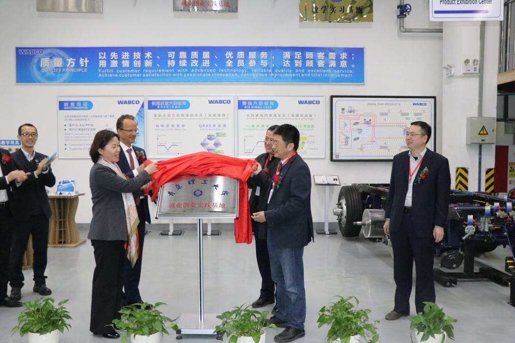 郭峰经理在致辞中指出,希望通过校企合作方式为老员工搭建创业平台,拓宽就业渠道,提高员工实践能力,实现双方互利共赢。相信通过这一平台,可以为双方优势互补、资源共享、相互促进、共同发展发挥积极作用。最后,威伯科集团全球副总裁、亚太区总裁于素杰女士与郭峰经理共同进行揭牌,宣布太阳成集团tyc234cc实习创新基地正式落户威伯科汽车控制系统(中国)有限公司,双方代表合影留念。