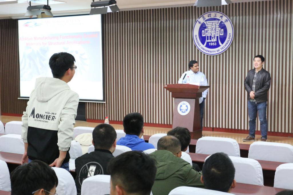 报告中,Devi Kalla教授介绍了增材制造的基础理论以及现有技术,如DLP、SLA等,并就功能梯度材料(FGM)展开了详细介绍。Devi Kalla教授主要阐述了功能梯度材料的应用领域、优势和前景,以及与复合材料的区别和存在的研究难点,并重点介绍了当前两种主要类型的金属增材制造方法:直接金属激光烧结(DMLS)和直接能量沉积(DED)。同时,Devi Kalla教授与大家一起讨论了金属梯度材料的机械性能和工业应用等相关问题。最后,Devi Kalla教授与在场的员工进行了热烈的讨论与互动,并耐心的解答了同学们提出的问题,对员工所感兴趣的内容进行了热心的指导。Devi Kalla教授讲解幽默风趣,内容引人入胜,赢得在场师生的阵阵掌声。