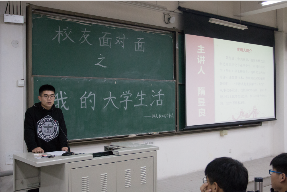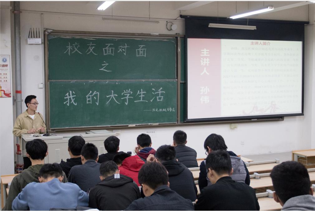 为更好的推进“精英培育计划”,促进员工学业、职业发展,助力员工实现梦想,11月24日下午,太阳成集团tyc234cc在B135教室举办了以“我的老员工活“为主题的”卓越员工面对面“分享会。此次分享会由2014级员工隋昱良和孙伟主讲,2018级辅导员徐卫晓及200多名机械专业的员工参加此次分享会。