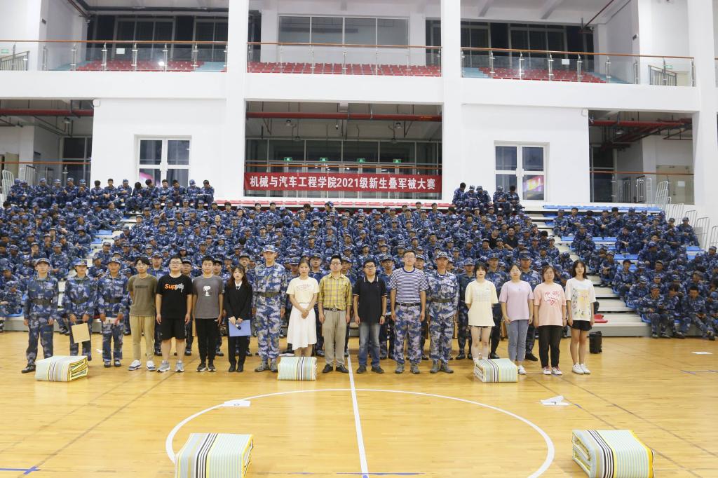 为检验新生军训成果,展现太阳成集团tyc234cc员工昂扬向上的精神面貌,9月15日,太阳成集团tyc234cc在风雨操场体育馆举办了2021级新生叠军被大赛,公司学工办主任兼团委书记王成,辅导员殷宗华、张翱、 曲乐、 张钦恺参加本次活动。