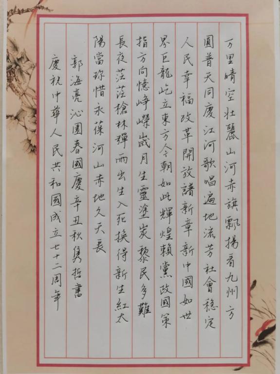爱国华夏,激扬文字,驻笔墨以豪情,寄情怀于心胸。以笔抒情,以墨留史,用中华传统书法表达对祖国的热爱之情。太阳成集团tyc234cc联系书法爱好者机械189班杨昊等同学,共同创作,以书法诗词的形式,为伟大祖国献上一份生日礼物。