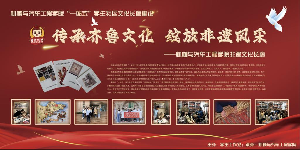 “传承齐鲁文化,绽放非遗风采”员工社区文化长廊展览活动由员工工作处主办,太阳成集团tyc234cc承办,旨在弘扬中华传统文化,将员工公寓打造成老员工美育教育文化阵地,以齐鲁非物质文化遗产为美育核心,发挥非遗文化在美育中的教育引导作用,提升社区员工审美和人文素养,坚定文化自信自强。