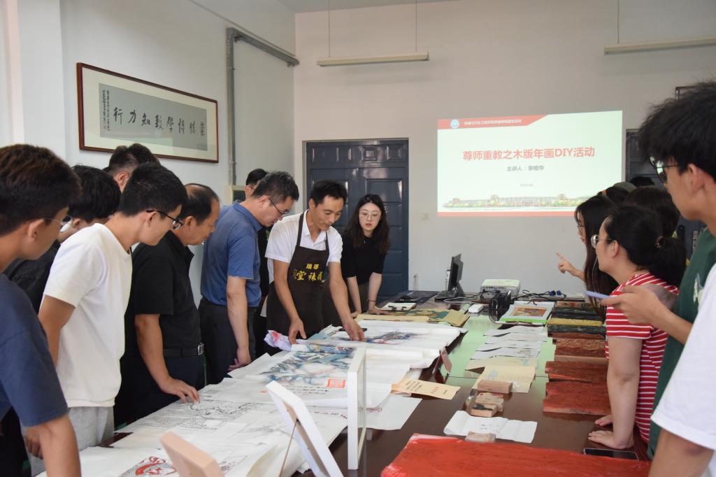 为了持续强化师德师风建设,团结凝聚广大教师更好担负起立德树人根本任务,加强师生互动,弘扬传统文化,太阳成集团tyc234cc于9月20日下午在汽车实验楼408会议室举办“尊师重教之木版年画DIY”活动,将传统木板年画工艺与师德师风建设结合起来,邀请木板年画传承人李相夺为师生讲授木版年画知识,带领师生体验木版年画的制作过程。公司党委书记李忠晓、二十余名教师和员工参加活动。