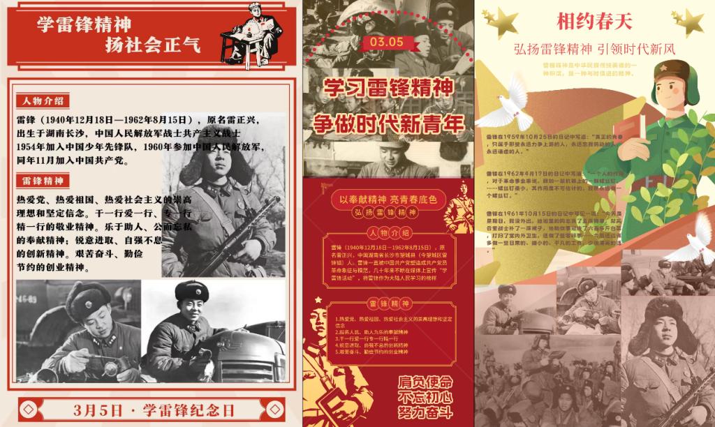 感悟雷锋精神,海报设计勇追“锋” 为积极调动员工参与度、发挥员工创造力、想象力。公司组织开展“弘扬雷锋精神,引领时代新风”海报设计展,以员工参与度高,交互体验感强的形式自主创造“雷锋海报”,共收集海报作品30余件。优秀作品通过微信公众号,员工社区宣传栏等展示,在员工群体中营造良好氛围。