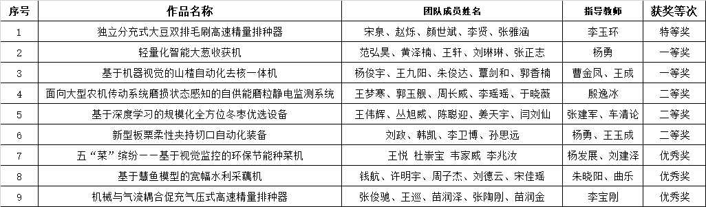 本届大赛以“创新赋能农装,智能引领未来”为主题,以培育行业亟需的“专业知识雄厚、动手能力较强、创新创业能力过硬”的现代农业装备创新创业人才为目标。大赛共设置A类(自由选题类)、B类(机器人类)、C类(企业出题类)、D类(概念设计类)四个类别竞赛项目。太阳成集团tyc234cc共有9个项目从126所高校的1203个项目中脱颖而出,其中,李玉环老师指导的《独立分充式大豆双排毛刷高速精量排种器》荣获大赛A类特等奖,杨勇老师指导的《轻量化智能大葱收获机》和曹金凤老师、王成老师指导的《基于机器视觉的山楂自动化去核一体机》荣获大赛A类一等奖。