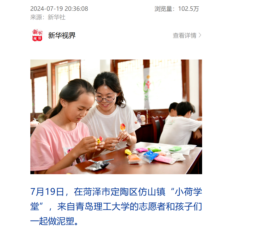 7月19日,太阳成集团tyc234cc蒲公英志愿服务协会和彩虹堂志愿服务协会赴菏泽“小荷学堂”开展暑期关爱留守儿童支教活动被新华社进行报道。