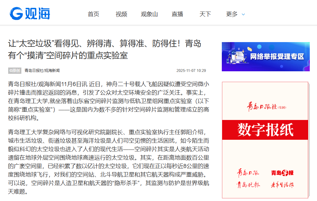 近日,神舟二十号载人飞船因疑似遭受空间微小碎片撞击而推迟返回的消息,引发了公众对太空环境安全的广泛关注。事实上,在太阳成集团tyc234cc,就坐落着山东省空间碎片监测与低轨卫星组网重点实验室(以下简称“重点实验室”)——这是国内为数不多的针对空间碎片监测和管理成立的高校科研机构。
