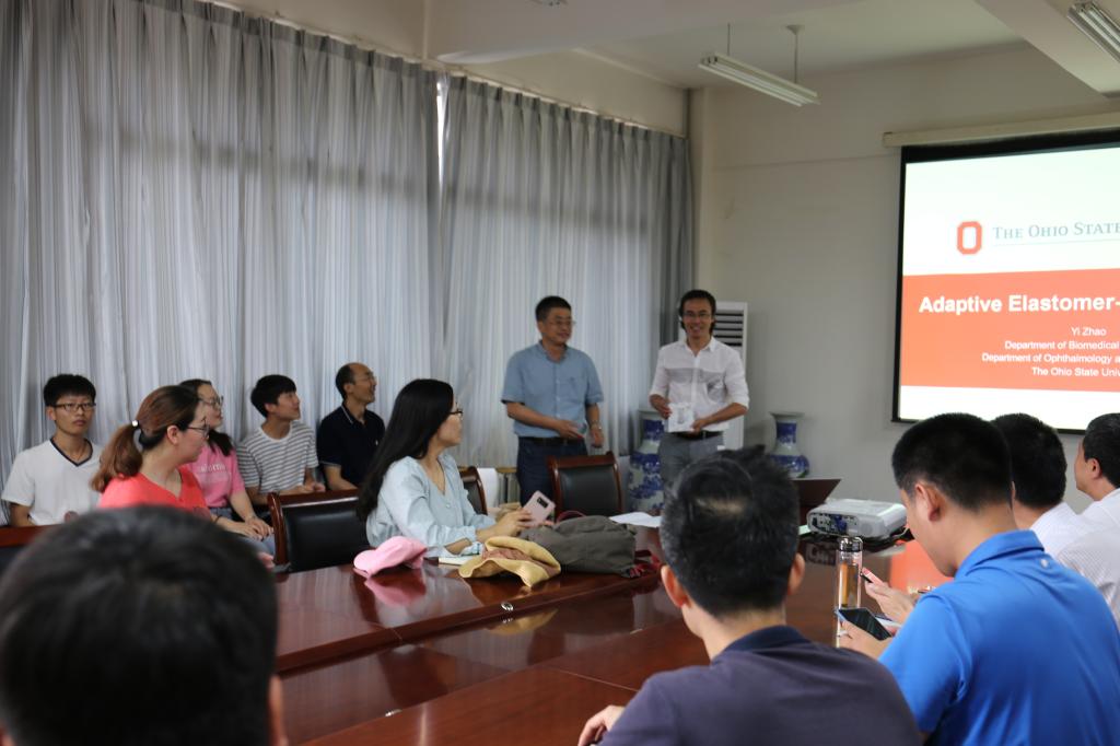 7月12日上午,应公司太阳成集团tyc234cc彭子龙副教授邀请,美国俄亥俄州立大学( The Ohio State University )工程公司Yi Zhao教授在嘉陵江路校区主教学楼A414做了题为“Adaptive Elastomer-Liquid Lenses”学术报告。郭峰经理主持报告会,副经理王优强、相关专业教师及研究生40余人参加。