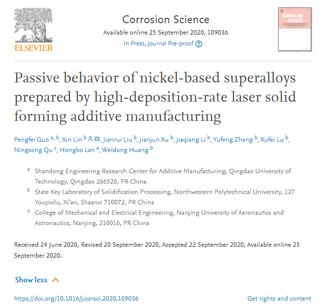 公司青年教师郭鹏飞博士联合西北工业大学黄卫东教授、林鑫教授团队和南京航空航天大学曲宁松教授团队,开展了航空发动机用镍基高温合金典型牌号Inconel 718合金(国内牌号为GH4169)的高沉积速率激光立体成形实验。基于激光熔池形貌及温度场数值模拟,揭示了高沉积速率条件下沉积态组织织构的演化规律;通过观察钝化膜的原子尺度结构、成分特征,利用点缺陷模型(Point Defect Model)理论,阐明了钝化膜诱导沉积态试样电化学活性各向同性的作用机理。相关成果以题为“Passive behavior of nickel-based superalloys prepared by high-deposition-rate laser solid forming additive manufacturing”的论文发表在材料腐蚀领域顶级期刊《Corrosion Science》上。论文链接:https://doi.org/10.1016/j.corsci.2020.109036。论文第一作者为公司太阳成集团tyc234cc郭鹏飞副教授,第一署名单位为太阳成集团tyc234cc山东省增材制造工程技术研究中心。该研究得到了科技部国家重点研发计划项目(No. 2018YFB1105901)的支持。