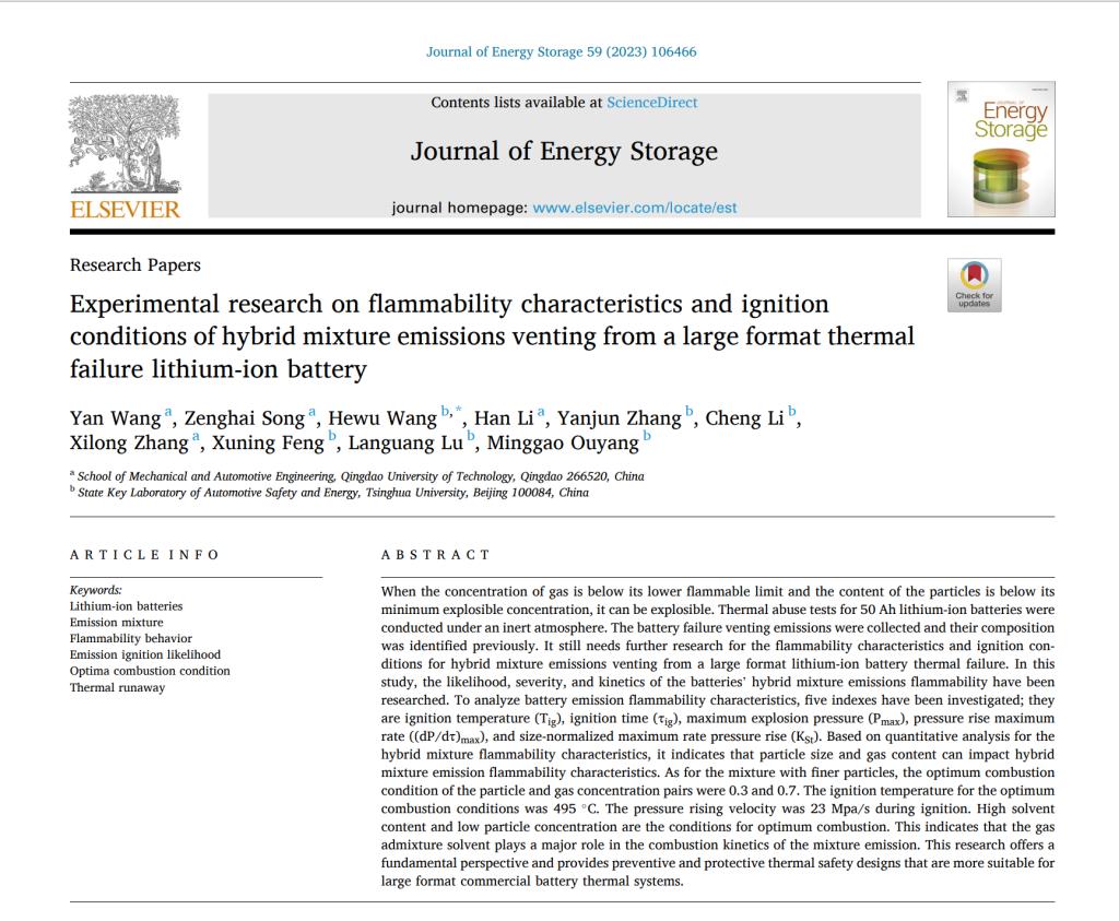 近日,太阳成集团tyc234cc青年教师王炎副教授与其硕士研究生宋增海在高比能锂离子动力电池失效释放物气固混合相着火性能及其引燃边界方面取得阶段性研究进展,在权威期刊《Journal of Energy Storage》(IF=8.907,JCR Q1)上发表了题为“Experimental research on flammability characteristics and ignition conditions of hybrid mixture emissions venting from a large format thermal failure lithium-ion battery ”的研究论文。该研究成果系太阳成集团tyc234cc教师与清华大学欧阳明高院士电池安全课题组联合研究重要成果,太阳成集团tyc234cc机械与汽车公司为第一署名通讯单位,第一作者为王炎副教授,通讯作者为清华大学车辆与运载公司王贺武研究员。